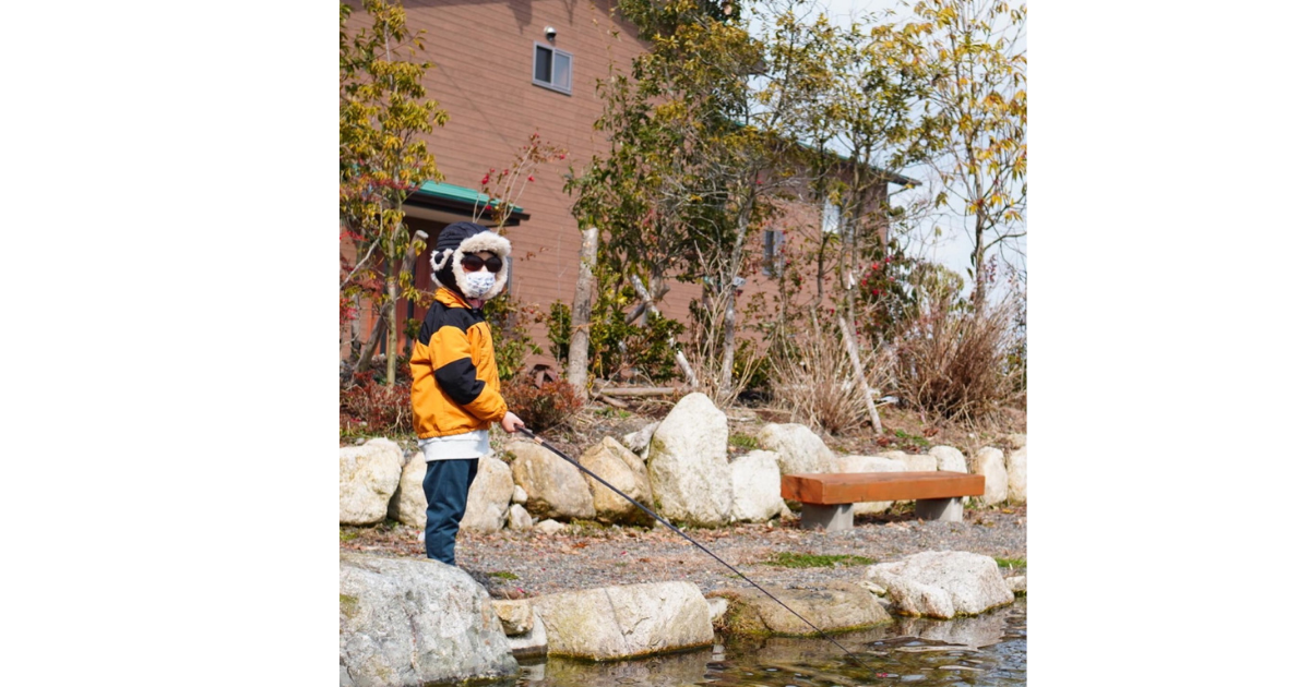 浅い水深の手づかみプールと、1段低くなっている餌釣りプールで、赤子はじめての釣り体験!